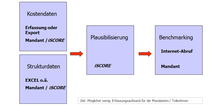 ![]() Die Daten des teilehmenden Unternehmens werden direkt aus der Nebnekosten-Buchhaltung exportiert und bei uns eingelesen und weiterverarbeitet. Zusammen mit den Objekt-spezifischen Stammdaten und Ihren Organisationsstrukturen werden die Daten nach der Plausibilisierung in das geschlossene Benchmarking-System übertragen und stehen Ihnen dann zur Auswertung zur Verfügung |